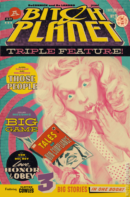 DeCONNICK & DE LANDRO PRESENT: THE TRIPLE FEATURE! Back for more?? Three talented teams bring the hot, hot heat to entrenched patriarchy everywhere. New stories from the front lines of BITCH PLANET…and all the backmatter you can handle. 100% Grade-A satire. Funny ’til it hurts.