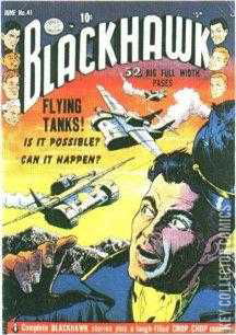 Home / DC / Blackhawk / Blackhawk #41 DC Released June 1951 Blackhawk #41 Add to Collection Want It Synopsis No synopsis available. Issue 34 of 265 Add to Collection Buy it on eBay Buy on eBay Low $95 Mid $290 High $965 Synopsis No synopsis available. Details Series Blackhawk Cover Date June 1951 Pages N/A UPC N/A Cover Price N/A Final Order Cutoff N/A Creators Cover Artist Reed Crandall Price Guide Log in or subscribe to access detailed graded price information and market insights. Log In Subscribe
