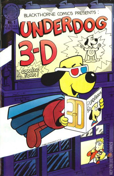 "Underdog 3-D #1" Sometimes listed as Blackthorne 3-D Series (1985) #43. Writers Jorge Pacheco and Mark Marcus, Penciler Jorge Pacheco, Inker Andy Ice, 3-D effects by Bob Fritsch and Cover Artist Jorge Pacheco. Blackthorne Publishing presents another in its series of 3-D comics, this one featuring the beloved 1960s cartoon hero Underdog. "Underdog Wanted Dead or Alive" Underdog is framed for a crime he didn't commit. "Three Ring Threat!" Underdog faces danger in a circus. B&W with 3-D effect red and blue on standard paper with a $2.50 Cover price.