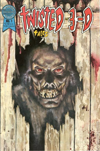 Stories by Richard Corben, Bruce Jones, and Butch Guice. Art by Richard Corben, Thom Enriquez, Butch Guice, John Totleben, and John Bolton, plus 3-D effects by Bob Fritsch. Wraparound cover by Steve Huston. Sometimes listed as Blackthorne 3-D Series (1985) #7. Blackthorne Publishing presents another in its series of 3-D comics, this one featuring horror tales that originally appeared in Pacific's Twisted Tales series. In one story, a man goes out to walk his dog, but when the full moon changes him into a werewolf, a strange reversal occurs. Terminated; Way Down There Below In the Dark; First Impressions; Evening Walk; You, Illusion. B&W with 3-D effects.