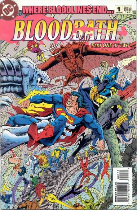 BLOODLINES: BLOODBATH PART 23 Continued from L.E.G.I.O.N. Annual #4 The heroes capture Glonth and track the parasites back to their base where they are shocked that the six remaining parasites sacrifice their lives to feed the Taker which rises out of its pit. After it shrugs off the heroes' attacks, Superman flies for help. Continues in Bloodbath #2