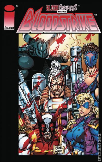 Blood Brothers: Prelude. Story by Rob Liefeld and Eric Stephenson . Art by Rob Liefeld, Dan Fraga, and Danny Miki. When the government needs a job done, they call in the best, they call in Bloodstrike. An elite group of metas and efficient killers who accomplish their missions with deadly precision. Created out of Project: Born Again, Bloodstrike consists of Fourplay, giantess with four arms of terror, Deadlock, psychotic ex-member of the nefarious Four, Tag, the lassie with the freezing touch, Shogun, robotic killing machine, and Cabbot, their leader who has a mysterious connection to Battlestone, the leader of Brigade. Story continues in Brigade (2nd Series) #1. Embossed cover