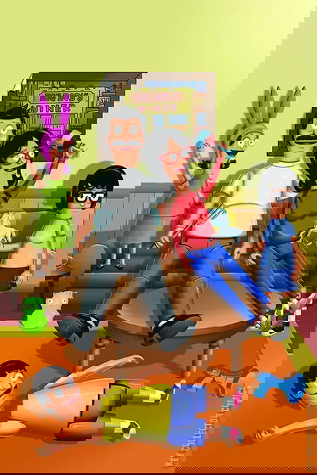The final issue in the first-ever Bob's Burgers miniseries, featuring five original stories of the Belcher family! In a post-apocalyptic wasteland, Tina finds a familiar face; Bob cultivates a list of literary classics; Louise tries to shed light on a Boyz 4 Now mystery while denying having any interest in them whatsoever; Linda imagines an alternate universe; and Gene presents a musical set at Robot College.