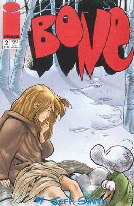 Fone Bone (now donning boots, a blanket cape, and a paper bag hat) is in the process of working on his house when Miz Possum comes by with her three sons to give Fone Bone some more supplies. Miz Possum leaves her sons in the care of Fone Bone for a short while. The kids get away from him while playing, and he chases after them to find they have been caught by the two rat creatures from earlier. Fone saves the kids and tells them to run away while he leads that rat creatures off of their trail. The rat creatures chase Fone Bone for a while, and the chase ends with the Great Red Dragon scaring them away. Afterwards, Fone Bone tries to tell Miz Possum about the dragon, and she refuses to believe him. Making his way to the hot spring to clean up, Fone runs into a beautiful woman removing her trousers to collect some water from the spring. Fone is immediately smitten. She reveals her name to be Thorn, the person whom Ted told him to seek, and Fone goes off with her to her home.