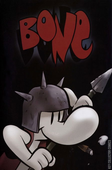 Gran'ma Ben puts Smiley Bone in charge of watching over her two stupid, stupid prisoners. But is there a method to her madness? Also, Fone Bone and Thorn reach the end of the road. Only three issues left!Fone Bone looks for Thorn on Bartleby's back. They see her running from Rat Creatures by running into ghost circles. To find Thorn while remaining hidden from the Rat Creatures, Fone hides underneath Bartleby, clinging to his stomach fur, suggesting the trick used by Odysseus to conceal his men from Polyphemus. Beyond the Rat Creatures' location, they encounter Thorn as she emerges from a ghost circle. All three climb the mountains to seek the Crown of Horns. At the city, the Pawans are battering the gates; Rose has the door flung open as the Pawas charge. Smiley captures the two Rat Creatures who had pursued the Bone cousins throughout the series and has them spared. Fone and Thorn sneak past Roque Ja in order to reach the dragon graveyard, but fail when Roque Ja sees them. He stares at them for a moment, then lets them leave unharmed. Thorn leaves without Fone Bone by facing an army of their enemies and flying over them, forcing Fone Bone to hide under Bartleby again. They continue to the dragons' graveyard, which Bartleby refuses to enter.