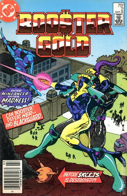 After last issue's defeat, Booster laments his loneliness and his separation from his family. Later, while filming a television commercial near a prison, Booster again meets and battles Blackguard and Mindancer.