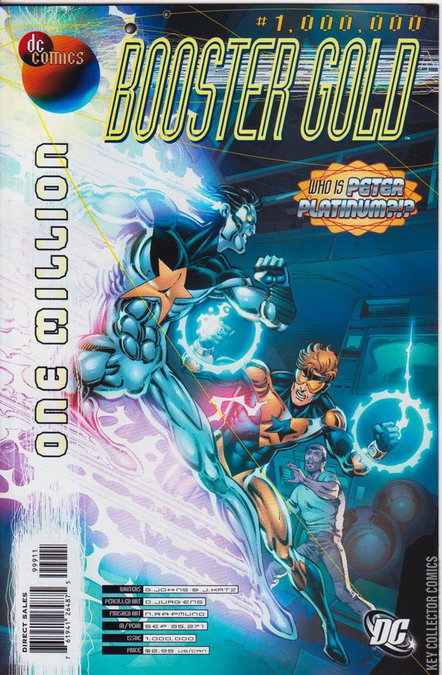 BLUE & GOLD, CONCLUSION: HOLDING BACK THE YEARS Meet the greatest time-traveling hero of the year 1,000,000 A.D.—PETER PLATINUM! Lost in time, Booster Gold is confronted by a hero a million times more self-involved than himself. But if Booster does find his way back to the present, Batman will be waiting for him.