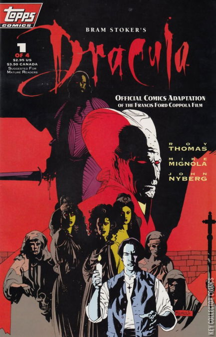 1st printing was Polybagged with cards, 2 of which feature Mignola artwork. Writer Roy Thomas, Artist Mike Mignola, Inker John Nyberg, Cover Art Mike Mignola. The very first comic from Topps! It's the official adaptation of the Francis Ford Coppola film, starring Gary Oldman, Winona Ryder, Anthony Hopkins and Keanu Reeves! Faithfully adapted from James V. Hart's screenplay by Thomas, Mignola and Nyberg. Issue #1 arrives almost a month before the film's November premiere, and chronicles the origin of Dracula, depicting his transformation from Vlad the Impaler into the accursed vampire! Plus: Behind-the-scenes photos and interviews! Mature Readers, full color 32 pages on standard paper with a $2.95 cover price.