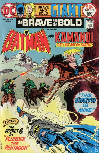 THIS EART IS MINE Kamandi is fleeing an army of Ape Men lead by a strange new animal named Captain Bat (really Batman , posing as an animal.) When Batman chases Kamandi away from the others he allows the boy to escape. Kamandi tames a wild horse and ends up riding to Mount Rushmore, where he seeks cover behind a radiation belt that the animals believe are gods that require to be fed. The mountain is surrounded by a strange radiation belt that the animals cannot cross. Inside a cave, Kamandi is shocked to find that there are other humans hiding out there. These humans have managed to trick the animals into thinking the mountain is a god by playing a tape recorder over the sound system. They kept themselves alive by taking the food offerings the animals would leave. Batman arrives soon after (having left behind arguing packs of Bears and Apes) and the people in the cave tell Kamandi that they brought the learned of Batman's existence from old comic books and used ancient Indian magic to summon him from the past to help them escape the mountain. The spell didn't quite work so well, and Batman was transported some mile away from them, forcing Batman to pose as one of the beasts when he was found by the Gorillas. Batman uses the tape recorder to send out a message to the bears asking them to bring him a downed aircraft he saw earlier back. While they are distracted, Batman leads the others to an escape. However, one of the gorillas (suspicious of this "god" the Bears worship) stays behind and notices the humans escaping and calls the others back. The humans flee to an long abandoned rail car, however Batman is captured by the animals and is rescued by Kamandi. They all manage to get away when they release the cars breaks causing it to roll down the rail line at such a speed as to lose the animals. Having succeeded, the humans and Kamandi thank Batman for his help and send him back to his own time. Awakening there to find Commission Gordon waiting over him with all sorts of questions, Batman can only hope that the dystopian future he has witnessed can somehow be avoided. PLUNDER THE PENTAGON This story is reprinted from Secret Six #2. THE BEASTS THAT BATTLED BATMAN