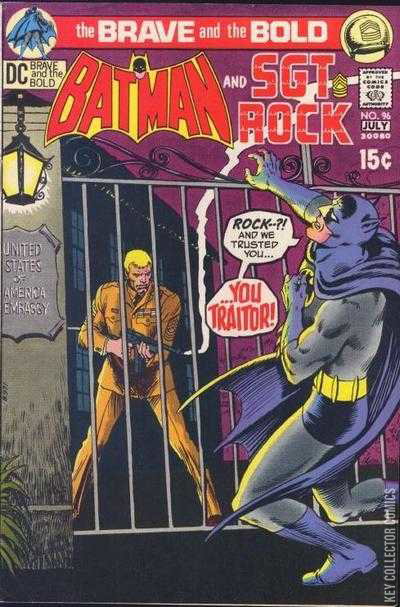 THE STRIPED PANTS WAR! When friend of Bruce Wayne, Ambassador Adams is murdered by the Companeros De La Muerte, a terrorist outfit, Bruce Wayne is asked to go to the country of the Companeros' origin as temporary ambassador and sign a treaty before a given deadline, the President and the Secretary of State have asked Batman to act as Wayne's bodyguard (Batman making an appearance at the meeting thanks to Alfred in disguise.) Flying to the country, Bruce is surprised to see that Sgt. Rock has been stationed as the embassy's chief of security. Rock is upset that after 30 years of service that he's been delegated to embassy duty and being given a hard time after botching protecting the ambassador. Believing there is a traitor in their midst, Batman begins to suspect Rock as the one working with the Companeros, however when they make an attempt on the ambassador's life, Rock and Batman fight together to fight them back. During the battle, embassy staffer Carlyle is revealed to be the tractor, however before he can shoot the ambassador, Alfred shoots Carlyle from behind. Afterwards, the treaty is signed, and Rock is taken back into the military and reassigned.