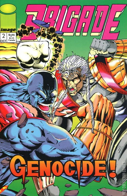 "Eve of Destruction" The alien Genocide is wreaking destruction on the streets of Los Angeles, demanding that Brigade challenge him. When the team does arrive, Genocide shows off his knowledge of the various members, taking them down one by one. Battlestone appears to get the upper hand, however, knocking Genocide out. But as the team debates what to do with the alien, Genocide revives and renews his attack, although with his universal translator now damaged Brigade can no longer understand him. When Brigade continues to humiliate him, Genocide resorts to toppling a building in order to distract them. Atlas props it up, but moments later he and the rest of Brigade vanish in a flash of light, and the building collapses. Genocide believes Brigade to have been killed in the collapse, but soon he too is beamed away. Brigade now finds themselves in an arena on Genocide's homeworld. "Awakenings" A strange being warps into G.A.T.E. Headquarters. He produces an orb - a Genetic Fusion Module - and attempts to use it with G.A.T.E.'s own genetic matrices. The orb explodes, damaging the being's ability to warp back out. But his mission was a success, for a powerful woman has appeared. She does not recognize the being, but agrees to help him escape the building. An alarm sounds, and G.A.T.E. security rushes to the lab. The story of Infiniti continues in Shadowhawk vol. 1 #2. This issue includes a pin-up of Battlestone and Cabbot Stone titled "Blood Brothers" by Dan Fraga and Danny Miki as well as trading cards of Thermal and Atlas. Includes centerfold insert coupon for Image Comics #0