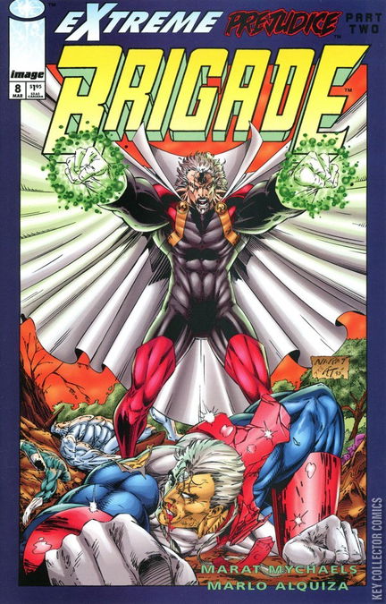 Extreme Prejudice pt. 2. Story by Rob Liefeld and Eric Stephenson. Art by Marat Mychaels and Marlo Alquiza. Continued from Team Youngblood #7. The ultra powerful menace known as Quantum has escaped and comes calling. He has already thumped Team Youngblood and now it's Brigades turn. The mega-crossover event continues here. Story continues in Bloodstrike #9. Include coupon #2 of 7 for Extreme Prejudice #0. Plus, a 2 page Black and White back-up story and an Extreme Studios check-list.