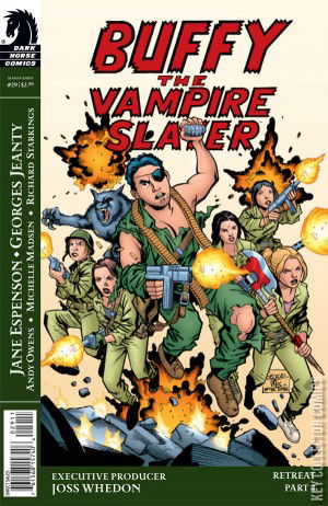 RETREAT part 4 (of 5)Ongoing Oz's temple in the Tibetan mountains is no longer a safe retreat for Buffy and her troops. Discovered by Twilight's magical agent, Amy, and bereft of their own magic, the army is preparing for a human war with guns, grenades, missiles . . . and MANPADS-it's not a laughing matter. People are about to die. But even without her own magic, Buffy is still a Slayer-the Slayer-and she has to lead the way to victory. Or at least . . . live to fight another day. o Executive produced by Joss Whedon. o 2009 Eisner Award Nominee for Best Cover Artist-Jo Chen.