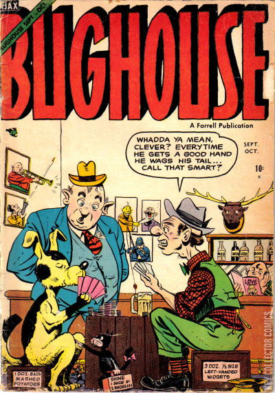 Home / Farrell / Bughouse / Bughouse #4 Farrell Released October 1954 Bughouse #4 Add to Collection Want It Synopsis No synopsis available. Issue 4 of 4 Add to Collection Buy it on eBay Buy on eBay Low $25 Mid $75 High $250 Synopsis No synopsis available. Details Series Bughouse Cover Date October 1954 Pages 36 UPC N/A Cover Price $0.10 Final Order Cutoff N/A Creators No creators listed. Price Guide Log in or subscribe to access detailed graded price information and market insights. Log In Subscribe