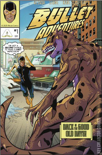On the eve of his death, elderly Dale DeSouza is sent back in time to the Silver Age period where he was the speedster superhero, BULLET. De-aged via the time travel, he faces off against one of his earliest adversaries and searches for a way to return to his own time. Bullet vs. Leopard Gecko cover.