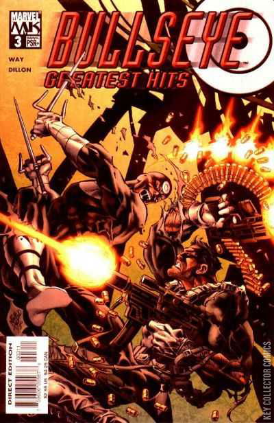 Steve Dillon is up to it again creating some the of the best pistoral storytelling to ever grace the page. Opening with a shot of a dead hired hand, Bullseye has signed his victims shirt with a witty, clever quote.This book takes off in the same direction as the last, a verbal fairy-trail account of Bullseyes whereabouts and howabouts. We see Bullseye in containment behind glass, hands locked in state-of-the-art handcuffs. All visitors appear in hospital gowns. Making an appearance is Frank Castle, The Punisher. With a last page splash of Elektra.