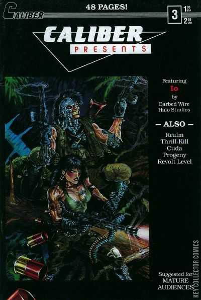 "Io, Part 2: Fleshette" by Barbed Wire Halo Studios "Heart of Darkness: The Saga of Cuda, Chapter 3" by Tim Vigil, Tim Tyler and Kimberley Richardson As Cuda stalks his hated enemy, the sorcerer Arson, the spirit of his father speaks to him through a statue of a angel, foretelling of a woman who is key to Cuda's success. His progress is slowed by more of Arson's demons, but Cuda continues in the maze until he comes upon a freshly killed demon. Out of the shadows, a figure springs upon him. "The Realm: Glitch" by Guy Davis and Randy Zimmerman Lord Darkoth has his trusted aide training his protege Sandra in the dark arts. In her lesson, an unknown entity enters her chambers. At first seemingly harmless, the creature known as Glitch asks permission to stay and pledges loyalty to Sandra, but soon hints at a more dangerous hidden nature. Sandra banishes him with ease, giving the aide some pause about Sandra's capabilities and Darkoth's ability to control them in the future. "Thrillkill: Odds Maker" by Mark Winfrey and Daniel Roy McKinnon Tyrelious Belizonz, aka Thrill-kill has been taken captive by the Eltrites, but they need his help in the battle against the High Priest, so they send in their leaders daughter, Laana, to convince him. "Revolt Level" by Eric Hess and Brian K. Ward In this future society, genetics is an advanced science...so much so that the Government can detect revolutionaries by a simply scan and reliably eliminate their threat with extreme prejudice, regardless of their age. Tell that to the exterminators who get the assignment which points him to a child's crib. "Caliber Bonus: Progeny (Preview)" by Jim Calafiore