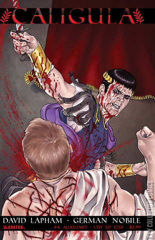 David (Crossed) Lapham unveils a new tale of ancient Rome and the most feared emperor of all time. The one name that still speaks volumes of how absolute power can corrupt - Caligula. Assassination attempts against him have failed and Caligula now demands blood vengeance. Can Felix keep his focus and sanity in the face of so much misery and horror? A modern master of horror, Lapham digs deep into the world of Rome 37 AD and offers a unique epic of sin. Joined by new talent German Nobile who promises to serve up fully-painted pages dripping with blood, this all-new, full-color series will be six issues of evil that will make any Crossed fan smile with glee. For in the age of Caligula, all roads lead to Hell. Caligula #4 is available with a Regular cover by Jacen Burrows, a Wraparound cover by series artist German Nobile, and a special rare Golden retailer incentive.