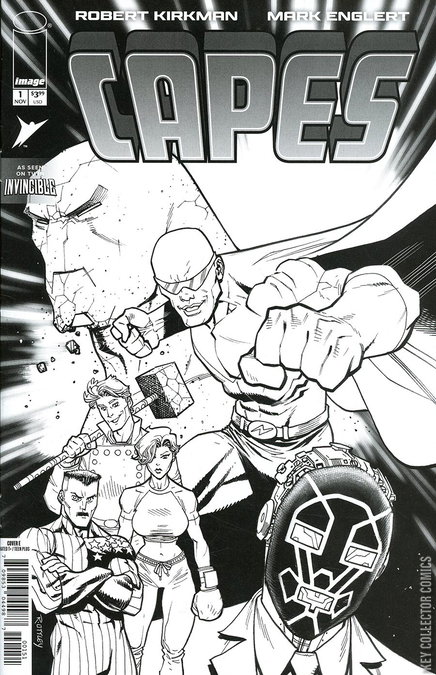 NEW SERIES LONG OUT-OF-PRINT AND VERY IN-DEMAND! RE-INTRODUCING ROBERT KIRKMAN AND MARK ENGLERT’S CORNER OF THE INVINCIBLE UNIVERSE! A special remastering of CAPES, featuring new art and dialogue! BOLT! KID THOR! KNOCK OUT! CAPTAIN COSMIC! CLAIRE VOYANT! BIG BRAIN! COMMANDER CAPITALISM! Welcome to Capes Inc, employers of your favorite super heroes that protect—well, at least when they’re on the clock—New York City from threats like MACHINE HEAD, TITAN...and now are in the crosshairs of an enemy they never expected!