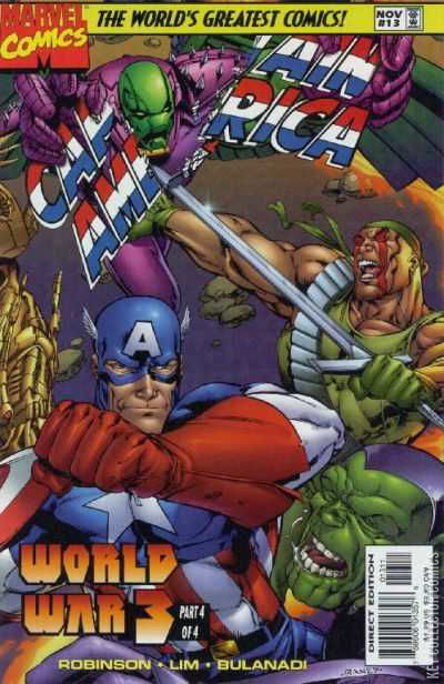 "World War III, Part IV: War Without End" Captain America leads the surviving heroes (Void, Grifter, the Thing, Invisible Woman, Maul, Zealot, Gorgon, Majestic, Warblade, Deathblow) and the United States Military forces (including Rick Jones and Eddie "Grunge" Chang) in an assault on Latveria. Mister Fantastic's group fights Doctor Doom's army at the site of the dimensional Lock in the Negative Zone. Winter, Triton, and Battalion die fighting, and Spartan gives his life to open the lock. The American Forces are attacked by waves of Skrulls, Daemonites, and the Elementrons, four heroes possessed by Daemonites (Hulk, Sub-Mariner, Human Torch, and Rainmaker). Gorgon, Rainmaker, Grunge, Sub-Mariner, Thing, Hulk, Human Torch, Maul, and Warblade are confirmed casualties. Captain America and Deathblow reach Castle Doom and are attacked by Helspont. Deathblow hurls Helspont and himself into the Negative Zone, Captain America is shot by a Skrull whom he takes down with his shield, and Rick Jones destroys the portion of the lock in Latveria with a grenade. The world ends, to be reformed as two other worlds; the Heroes Reborn Universe and the WildStorm Universe.