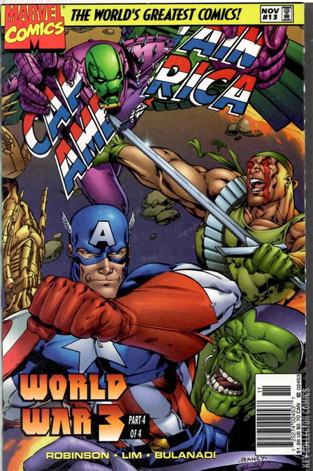 "World War III, Part IV: War Without End" Captain America leads the surviving heroes (Void, Grifter, the Thing, Invisible Woman, Maul, Zealot, Gorgon, Majestic, Warblade, Deathblow) and the United States Military forces (including Rick Jones and Eddie "Grunge" Chang) in an assault on Latveria. Mister Fantastic's group fights Doctor Doom's army at the site of the dimensional Lock in the Negative Zone. Winter, Triton, and Battalion die fighting, and Spartan gives his life to open the lock. The American Forces are attacked by waves of Skrulls, Daemonites, and the Elementrons, four heroes possessed by Daemonites (Hulk, Sub-Mariner, Human Torch, and Rainmaker). Gorgon, Rainmaker, Grunge, Sub-Mariner, Thing, Hulk, Human Torch, Maul, and Warblade are confirmed casualties. Captain America and Deathblow reach Castle Doom and are attacked by Helspont. Deathblow hurls Helspont and himself into the Negative Zone, Captain America is shot by a Skrull whom he takes down with his shield, and Rick Jones destroys the portion of the lock in Latveria with a grenade. The world ends, to be reformed as two other worlds; the Heroes Reborn Universe and the WildStorm Universe.