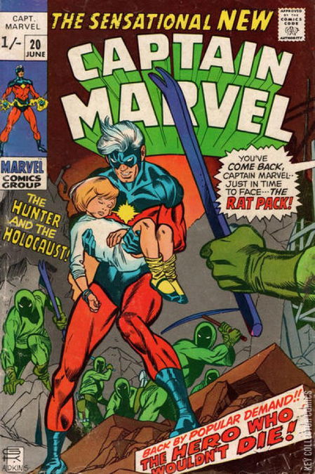 The Hunter And The Holocaust!Inside a bar in Greenwich Village, Rick Jones performs on stage with his guitar and the teenage girls in the crowd go wild at their new favorite rock star. After his set finishes, Rick is approached by a man who wants to be his agent but Rick blows him off and leaves. Arriving at his run down apartment, Rick wonders if he’ll ever establish his own identity when Mar-Vell’s face appears in a mirror. Captain Marvel asks Rick why he hasn’t called on him or allowed him to leave the Negative Zone via the Nega Bands. Rick says he’s not sure of his own identity anymore and he needs time to find himself. Mar-Vell understands Rick’s issue but reminds him he used to be partners with The Hulk, a helper to The Avengers as well as Captain America’s sidekick. Mar-Vell knows Rick was tired of being a sidekick and wanted to be a hero himself and sharing identities with Captain Marvel was his one chance of finally doing that.A confused Rick hears a fight outside his apartment and runs out to see some thugs mugging an old man. Rick takes them on himself despite Mar-Vell’s warning and ends up getting a beating himself. Realizing his mistake, Rick uses the Nega Bands to swap places with Captain Marvel who makes short work of the muggers. Knowing Rick can hear him when he speaks out loud, Mar-Vell wants to discuss how they can both exist on Earth at the same time. Rick says if anyone can figure this out it’s his old pal Bruce Banner and gives Mar-Vell the location of one of Banner’s secret desert bases.On his way to the base, Captain Marvel sees a town that has recently been devastated by a tornado. The hero flies down to help only to see an armed gang of looters called the Rat Pack have arrived and are stealing the medical supplies. Again, Captain Marvel makes short work of his opponents and after helping clear the debris, resumes his journey to find Banner. Inexplicably while still flying, Captain Marvel suddenly loses control and crashes...