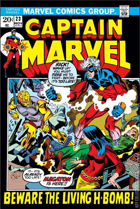 "Death at the End of the World!" - Captain Marvel's battle with Megaton comes to an end. Megaton is carted off to prison while Rick's photon levels are too low to maintain his form as Captain Marvel. While there, Megaton reminisces about his origins before draining his cellmate's life force and breaking out. Sensing photon energy, Megaton begins his hunt for the helpless Rick Jones!