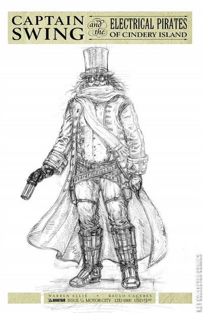From the sparking-mad mind of Warren Ellis, the creator of AETHERIC MECHANICS and DOKTOR SLEEPLESS, comes an electrical romance of a pirate utopia thwarted: CAPTAIN SWING & THE ELECTRICAL PIRATES OF CINDERY ISLAND. This crackling new mini-series is illustrated in Raulo Caceres' stunning woodcut style, and presented in full color. London, 1830: newly-minted copper Charlie Gravel keeps seeing things he's not supposed to. A crooked Bow Street Runner with a flintlock revolver, flying things that are not supposed to fly, and the violent Scientific Phantasmagoria that is christened Spring-Heeled Jack, but is known by other names. It is the time of Captain Swing and his Electrical Pirates, and history will never be the same. CAPTAIN SWING #1 is available with a Regular or Wraparound cover by series artist Raulo Caceres, and a special retailer incentive Penny Dreadful cover designed to look like a classic novel of yore.