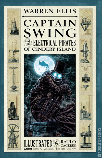 From the sparking-mad mind of Warren Ellis, the creator of AETHERIC MECHANICS and DOKTOR SLEEPLESS, comes an electrical romance of a pirate utopia thwarted: CAPTAIN SWING & THE ELECTRICAL PIRATES OF CINDERY ISLAND. This crackling new mini-series is illustrated in Raulo Caceres' stunning woodcut style, and presented in full color. London, 1830: newly-minted copper Charlie Gravel keeps seeing things he's not supposed to. A crooked Bow Street Runner with a flintlock revolver, flying things that are not supposed to fly, and the violent Scientific Phantasmagoria that is christened Spring-Heeled Jack, but is known by other names. It is the time of Captain Swing and his Electrical Pirates, and history will never be the same. CAPTAIN SWING #1 is available with a Regular or Wraparound cover by series artist Raulo Caceres, and a special retailer incentive Penny Dreadful cover designed to look like a classic novel of yore.