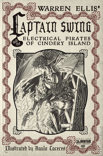 From the sparking-mad mind of Warren Ellis, comes an electrical romance of a pirate utopia thwarted: CAPTAIN SWING & THE ELECTRICAL PIRATES OF CINDERY ISLAND. London copper Charlie Gravel is on a boat ride to hell. He's about to discover what the people above his station really do to run the country, and to find out that, among the smugglers of the Blackwater and the dark creeks of Essex, there are such a thing as Electrical Pirates. This historical science-fiction piratical romance by Warren Ellis is illustrated in Raulo Caceres' stunning woodcut style, and presented in full color. It is the time of Captain Swing and his Electrical Pirates, and history will never be the same. CAPTAIN SWING #2 is available with a Regular or Wraparound cover by series artist Raulo Caceres, and a special retailer incentive Penny Dreadful cover designed to look like a classic novel of yore.