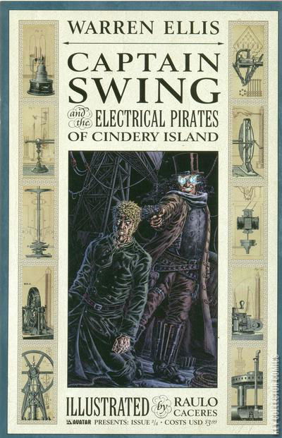 From the sparking-mad mind of Warren Ellis, comes an electrical romance of a pirate utopia thwarted: CAPTAIN SWING & THE ELECTRICAL PIRATES OF CINDERY ISLAND. London copper Charlie Gravel is on a boat ride to hell. He's about to discover what the people above his station really do to run the country, and to find out that, among the smugglers of the Blackwater and the dark creeks of Essex, there are such a thing as Electrical Pirates. This historical science-fiction piratical romance by Warren Ellis is illustrated in Raulo Caceres' stunning woodcut style, and presented in full color. It is the time of Captain Swing and his Electrical Pirates, and history will never be the same. CAPTAIN SWING #2 is available with a Regular or Wraparound cover by series artist Raulo Caceres, and a special retailer incentive Penny Dreadful cover designed to look like a classic novel of yore.