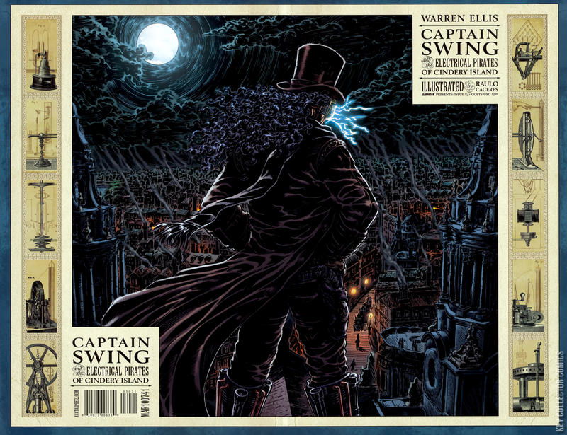 From the sparking-mad mind of Warren Ellis, comes an electrical romance of a pirate utopia thwarted: CAPTAIN SWING & THE ELECTRICAL PIRATES OF CINDERY ISLAND. Secrets are revealed, in the weird little pirate utopia of Cindery Island, as Captain Swing explains exactly what's been happening in the world over the last two thousand years or so. But the forces of Law are coming for them, and Law has no time for Pirates -- or Science. This historical science-fiction piratical romance by Warren Ellis is illustrated in Raulo Caceres' stunning woodcut style, and presented in full color. It is the time of Captain Swing and his Electrical Pirates, and history will never be the same. CAPTAIN SWING #3 is available with a Regular or Wraparound cover by series artist Raulo Caceres, and a special retailer incentive Penny Dreadful cover designed to look like a classic novel of yore.
