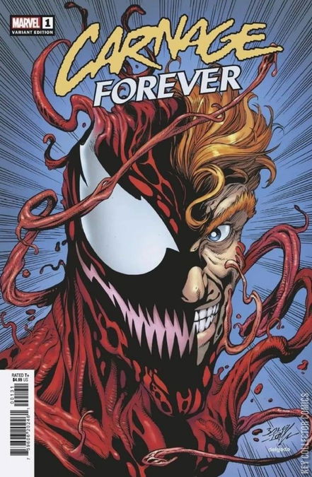 HOMECOMING / UNMADE IN HIS IMAGE / FUNNIES A KILLER CELEBRATION! Cletus Kasady is the most notorious serial killer in the Marvel Universe—and it’s been thirty years since his first introduction! Thirty years of monsters, mayhem and murder—AND YOU HAVEN’T SEEN ANYTHING YET! With an awesome assembly of creators, this issue will HAVE IT ALL! A look back on Carnage’s past, his present and, just maybe, the first hints you’ll ever get of his visceral and violent FUTURE!