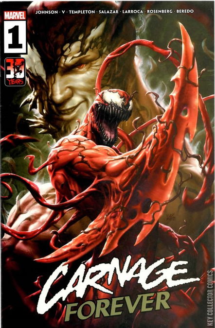 HOMECOMING / UNMADE IN HIS IMAGE / FUNNIES A KILLER CELEBRATION! Cletus Kasady is the most notorious serial killer in the Marvel Universe—and it’s been thirty years since his first introduction! Thirty years of monsters, mayhem and murder—AND YOU HAVEN’T SEEN ANYTHING YET! With an awesome assembly of creators, this issue will HAVE IT ALL! A look back on Carnage’s past, his present and, just maybe, the first hints you’ll ever get of his visceral and violent FUTURE!