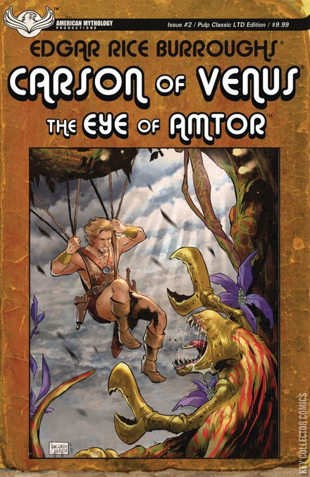 The official comics prequel to Matt Betts' upcoming Edgar Rice Burroughs Universe novel 'Carson of Venus: Edge of All Worlds' continues! With their friends held captive by a ruthless king, Carson and Duare have embarked upon a mission to collect the raw materials to build a telescope for the mad ruler... But those raw materials can only be found in the most dangerous locations across wild Amtor (Venus). It's an edge-of-your-seat thrill-ride as Carson and Duare race against the clock and face some of the most savage creatures imaginable in the opening story by Matt Betts and Mike Wolfer, gorgeously illustrated by Vincenzo Carratu. Then, the adventure of explorers Jason Gridley and Victory Harben at the Earth's core continues in the tale 'Pellucidar: Dark of the Sun,' by novelist Christopher Paul Carey and artist Mike Wolfer! Carson of Venus Eye of Amtor #2 is available with two covers - Main by Vincenzo Carratu and a limited edition 1 in 350 Pulp cover, also by Carratu.
