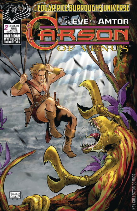 The official comics prequel to Matt Betts' upcoming Edgar Rice Burroughs Universe novel 'Carson of Venus: Edge of All Worlds' continues! With their friends held captive by a ruthless king, Carson and Duare have embarked upon a mission to collect the raw materials to build a telescope for the mad ruler... But those raw materials can only be found in the most dangerous locations across wild Amtor (Venus). It's an edge-of-your-seat thrill-ride as Carson and Duare race against the clock and face some of the most savage creatures imaginable in the opening story by Matt Betts and Mike Wolfer, gorgeously illustrated by Vincenzo Carratu. Then, the adventure of explorers Jason Gridley and Victory Harben at the Earth's core continues in the tale 'Pellucidar: Dark of the Sun,' by novelist Christopher Paul Carey and artist Mike Wolfer! Carson of Venus Eye of Amtor #2 is available with two covers - Main by Vincenzo Carratu and a limited edition 1 in 350 Pulp cover, also by Carratu.