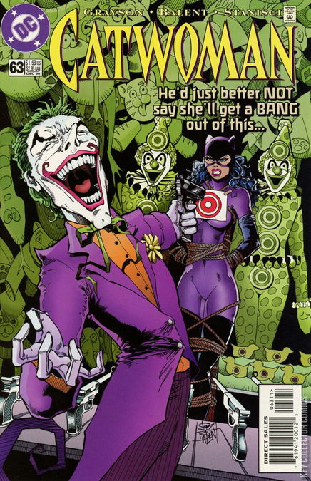 HINTS AND ALLEGATIONS PART 1 - BELLING THE CAT Catwoman is in the lion enclosure at the fairgrounds, searching for a microchip. She wards off the lion with pastrami and rummages through the straw until she finds the microchip in a little plastic bag. She takes the tunnel of love, thinking about how weird this job was. Why hire her to move an item from one end of the fairgrounds to another? She suspects a setup, but she checked with all her usual sources, and Zee said it was on the level. She jumps off the boat at the Henry VIII and Anne Boleyn exhibit where she is supposed to meet her contact, but no one's there. She calls out and hears two clcks in response as banana cream pies are launched from sprigged platforms at her. They hit her in the hips as Ann Boleyn is decapitated and she hears maniacal laughter. Three henchmen appear, and Catwoman fights them off as the executioner in the Ann Boleyn exhibit pulls off his mask to reveal the Joker. The Joker tells her the pies that hit her were made with a radioactive chemical called "tagyurit." It doesn't wash off, and now that she's been hit, he can find her anywhere. Catwoman asks what the Joker is doing out of Arkham, and he tells her he's playing Cupid for her and her boyfriend. Catwoman thinks it doesn't make sense, but the Joker rarely does. She runs, but the Joker is unconcerned--if she didn't, who would they chase? His henchmen open-fire on her as she swims away. Catwoman pulls herself out of the water and runs through the fairgrounds. She doesn't notice the missile following her until it's almost too late. She dodges right before it hits the ground and explodes, but another missile is already incoming. Catwoman steals a motorcycle and races off. The missile explodes behind her as she drives the motorcycle over the fence, out of the fairgrounds. The Joker and his henchmen chase after her in his car. Catwoman doesn't understand why he didn't kill her in the tunnel of love when she wasn't expecting it rather than in a public street, but she realizes he's not trying to kill her... he's trying to kill everyone around her. The more people he kills while he's chasing her, the funnier he'll find it. Catwoman doesn't have a boyfriend, she doesn't believe his radioactive chemical story, and she doesn't play these kinds of games. She races ahead, evading the Joker and his goons, but she doesn't get far before the street explodes underneath her. She realizes he does know where she's going. She knows all she's doing is endangering civilian lives by trying to evade him on the streets. She dives into Gotham Bay. Commissioner Gordon flings that day's edition of the Gotham Globe onto the table with its headline "Catwoman Blows Up Bridge." He says this is just what they need after the Joker's escape. The whole city will be panicking by noon. Harvey Bullock and Renee Montoya bicker over whether this is really Catwoman's M.O., and Montoya wonders if Catwoman and the Joker could be working together. Gordon doesn't know, but he knows who to ask. Catwoman breaks into a hotel. She now believes the tracking chemicals are real, but she does wonder whether the bay water washed them off in spite of his claims. She changes out of her costume as the Joker and his henchmen notice she's been staying in one place for a while. One of the henchmen comments that it's a good thing the Joker stole the chemical before the warden at Arkham Asylum began to use it on the inmates like he'd planned. The Joker shoots one of his men for suggesting they use another missile on Catwoman. He's bored of missiles. He asks Skippy what else they have. Catwoman wakes up when the fire alarm goes off in her borrowed hotel room. The entire building is on fire, and she quickly pulls on her Catwoman costume and jumps out. Catwoman watches the blaze from a safe distance and thinks, "Thanks to the Joker, you get anywhere near me, and you can kiss your life goodbye."