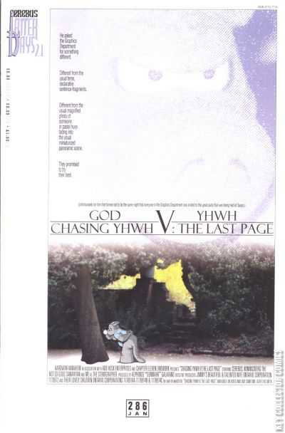 Easily a hundred times better drawn than "Chasing YHWH IV: The Final Chapter." Those who have seen advance pages are already declaring Cerebus #286 "possibly the first classic comic book of 2003." "Could very easily be the year's best." "A Harvey and Eisner contender." Also in this issue: hy Canada Slept, Pt. 3 of 3. (Please note that "Chasing YHWH V: The Last Page" will be available on Video and DVD later this week). The countdown to issue 300 (March, 2004) continues... t-minus 14 and counting!