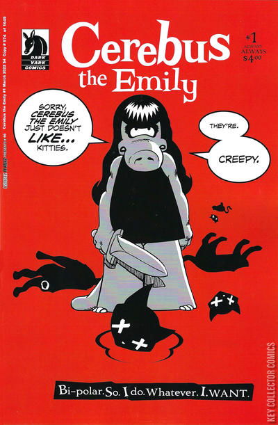 Ever wonder what Cerebus the Aardvark would have been like if, instead of being a barbarian aardvark, he had had perfect bangs, artfully applied mascara that made his eyes irresistibly sexy, a little black dress that barely covered his crotch, tailored to show off his sun-bronzed shoulders to their best advantage and adorable white, painted toenails? Well, hey, who hasn't? Now it can be told! See what happens when 'Daddy's Little Psycho' leverages her bipolarity and autism into absolute tyrannical control over everyone who crosses her path!