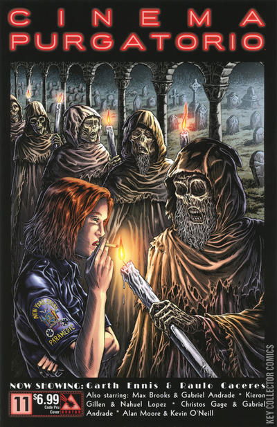 From the Civil War re-imagined with giant insects, to the dystopian giant monsters of the Vast. Seduced by the cute, yet overwhelmed, Pru or guffawing at the madcap Modded. Or just enthralled by the tapestry of cinematic history upon which Alan Moore is weaving another masterful tale, the finest anthology in history continues. Join a master class of sequential artisans as they spin stories to terrify and delight. Now showing: Cinema Purgatorio by Alan Moore and Kevin O'Neill, A More Perfect Union by Max Brooks and Gabriel Andrade, Code Pru by Garth Ennis and Raulo Caceres, Modded by Kieron Gillen and Nahuel Lopez, and The Vast by Christos Gage and Gabriel Andrade. Each story has its own cover by the series artist and there is also an Ancient Tome Premium edition limited to 1000 copies.