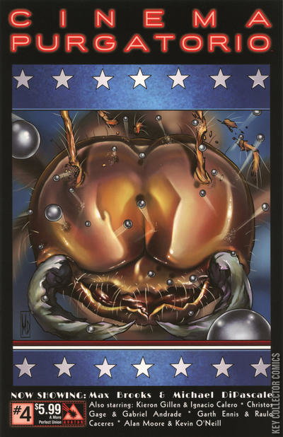 Sitting in the theater of Alan Moore's imagination you begin to notice some rather disturbing things. The floors are wet and the seats are tacky and have a noticeable smell of rot. A female usher walks down the aisle dragging a limp leg and shining a muted yellow beam filled with dust and debris into your eyes as she passes. You catch glimpses of seedy characters and acts happening around you. But the lights have gone down and the show is beginning. Enjoy a front row seat to the biggest names in comics delivering their finest works, all in luscious black& white. This issue continues Cinema Purgatorio by Alan Moore and Kevin O'Neill, A More Perfect Union by Max Brooks and Michael DiPascale, Code Pru by Garth Ennis and Raulo Caceres, Modded by Kieron Gillen and Ignacio Calero, and The Vast by Christos Gage and Gabriel Andrade. Each story has its own cover by the series artist and there is also an Ancient Tome Premium edition limited to 1000 copies.