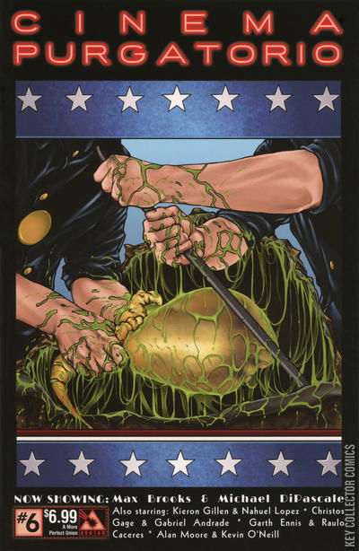 The lights are low and that surreal ticking noise from behind you could be the film reel or something else... As the first images begin to flicker across the screen, you feel the hairs on the back of your neck stand and a chill run down your spine. It's an like an old cartoon meant to amuse before the main feature starts - but something is very wrong with it. This is the beginning of Alan Moore's trip to the theatre of the unreal. Now showing: Cinema Purgatorio by Alan Moore and Kevin O'Neill, A More Perfect Union by Max Brooks and Michael DiPascale, Code Pru by Garth Ennis and Raulo Caceres, Modded by Kieron Gillen and Ignacio Calero, and The Vast by Christos Gage and Gabriel Andrade. Each story has its own cover by the series artist and there is also an Ancient Tome Premium edition limited to 1000 copies.