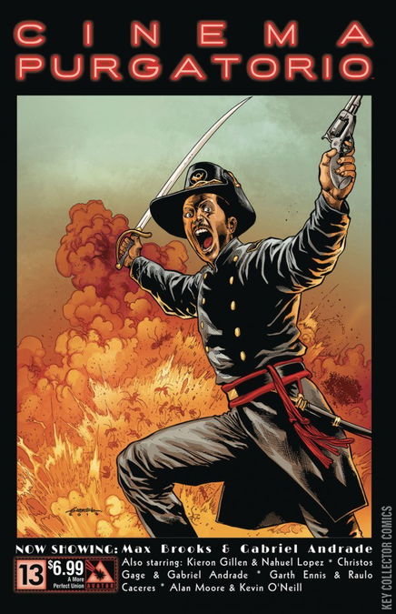 It's the USA vs Russia Monster Battle in The Vast! A More Perfect Union sees the relentless march of the insects present all-new concerns for the overwhelmed Army. In Code Pru, there appears to be a dinosaur in the city. Everyone's secrets are revealed while Alan Moore and Kevin O'Neill weave another tale in the tapestry of cinematic history. The finest anthology in comics today continues. Join a master class of sequential artisans as they spin stories to terrify and delight. Now showing: Cinema Purgatorio by Alan Moore and Kevin O'Neill, A More Perfect Union by Max Brooks and Gabriel Andrade, Code Pru by Garth Ennis and Raulo Caceres, Modded by Kieron Gillen and Nahuel Lopez, and The Vast by Christos Gage and Gabriel Andrade. Each story has its own cover by the series artist and there is also an Ancient Tome Premium edition limited to 1000 copies.