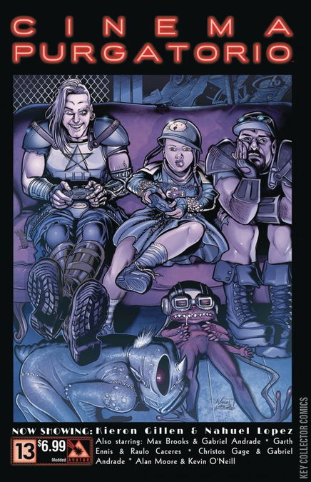 It's the USA vs Russia Monster Battle in The Vast! A More Perfect Union sees the relentless march of the insects present all-new concerns for the overwhelmed Army. In Code Pru, there appears to be a dinosaur in the city. Everyone's secrets are revealed while Alan Moore and Kevin O'Neill weave another tale in the tapestry of cinematic history. The finest anthology in comics today continues. Join a master class of sequential artisans as they spin stories to terrify and delight. Now showing: Cinema Purgatorio by Alan Moore and Kevin O'Neill, A More Perfect Union by Max Brooks and Gabriel Andrade, Code Pru by Garth Ennis and Raulo Caceres, Modded by Kieron Gillen and Nahuel Lopez, and The Vast by Christos Gage and Gabriel Andrade. Each story has its own cover by the series artist and there is also an Ancient Tome Premium edition limited to 1000 copies.