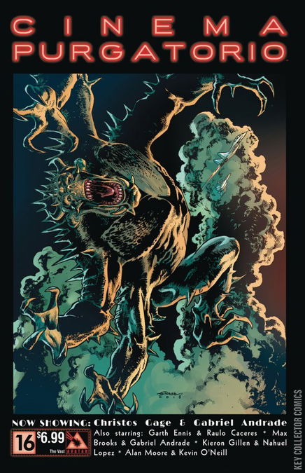 Join a master class of sequential artisans as they spin stories to terrify and delight in the finest anthology in comics. Now showing: Cinema Purgatorio by Alan Moore and Kevin O'Neill, A More Perfect Union by Max Brooks and Gabriel Andrade, Code Pru by Garth Ennis and Raulo Caceres, Modded by Kieron Gillen and Nahuel Lopez, and The Vast by Christos Gage and Gabriel Andrade. Each story has its own cover by the series artist and there is also an Ancient Tome Premium edition limited to 1000 copies.