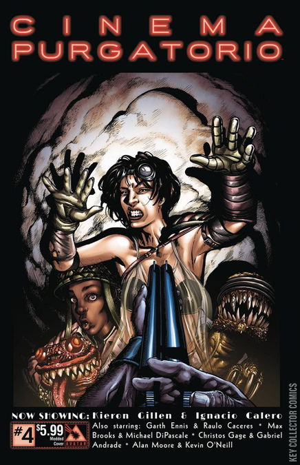 Sitting in the theater of Alan Moore's imagination you begin to notice some rather disturbing things. The floors are wet and the seats are tacky and have a noticeable smell of rot. A female usher walks down the aisle dragging a limp leg and shining a muted yellow beam filled with dust and debris into your eyes as she passes. You catch glimpses of seedy characters and acts happening around you. But the lights have gone down and the show is beginning. Enjoy a front row seat to the biggest names in comics delivering their finest works, all in luscious black& white. This issue continues Cinema Purgatorio by Alan Moore and Kevin O'Neill, A More Perfect Union by Max Brooks and Michael DiPascale, Code Pru by Garth Ennis and Raulo Caceres, Modded by Kieron Gillen and Ignacio Calero, and The Vast by Christos Gage and Gabriel Andrade. Each story has its own cover by the series artist and there is also an Ancient Tome Premium edition limited to 1000 copies.