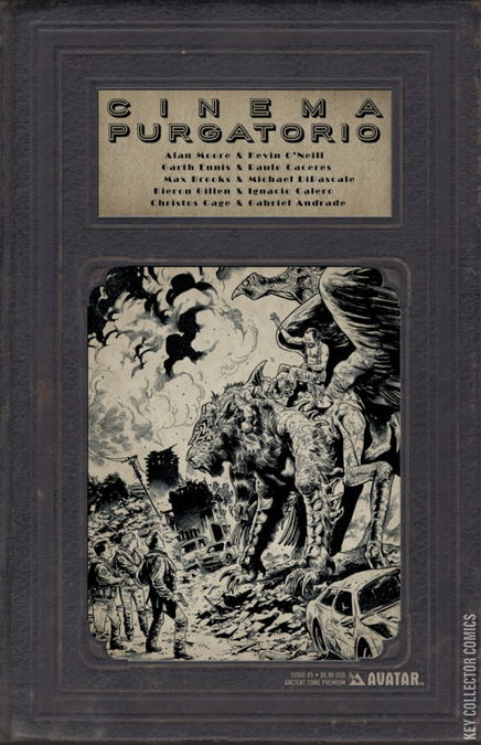 They've taken your ticket and ushered you to a seat. You know something is wrong here. You can feel it in the very fabric of the dingy and smoky theatre you sit in. It's an almost palpable dread you feel as the lights go down and the first reel begins to play... This issue continues Cinema Purgatorio by Alan Moore and Kevin O'Neill, A More Perfect Union by Max Brooks and Michael DiPascale, Code Pru by Garth Ennis and Raulo Caceres, Modded by Kieron Gillen and Ignacio Calero, and The Vast by Christos Gage and Gabriel Andrade. Each story has its own cover by the series artist and there is also an Ancient Tome Premium edition limited to 1000 copies.