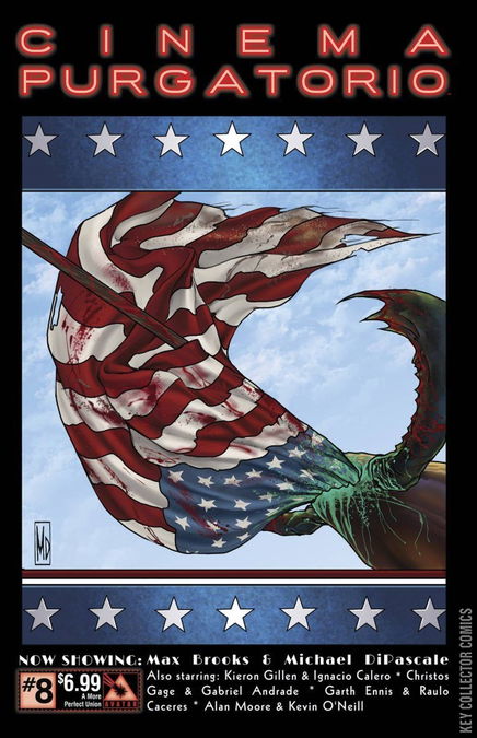 A deep seeded dread spreads over you as you sit in the otherworldly movie theatre. The smell of burnt popcorn is tinged with something else, something coppery... blood? As the first film starts to dance across the screen you hear a strangled choke from behind you. What have you gotten yourself into? This is the theatre of the surreal from the imagination of the one and only Alan Moore! Prepare yourself for twisted tales from the masters of the art form. Now showing: Cinema Purgatorio by Alan Moore and Kevin O'Neill, A More Perfect Union by Max Brooks and Michael DiPascale, Code Pru by Garth Ennis and Raulo Caceres, Modded by Kieron Gillen and Ignacio Calero, and The Vast by Christos Gage and Gabriel Andrade. Each story has its own cover by the series artist and there is also an Ancient Tome Premium edition limited to 1000 copies.