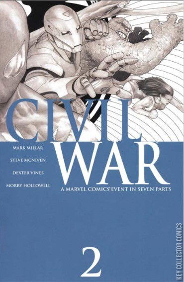 Civil War Part Two of Seven The super-heroes split as the CIVIL WAR heats up! Registration has become law, household names have gone rogue and a Marvel legend makes a decision that will change a life forever. Featuring the NEW AVENGERS, the FANTASTIC FOUR, the YOUNG AVENGERS and pretty much everybody else! And, no fooling, true believer... this issue features one of the most shocking climaxes in Marvel Comics history. Miss THIS one and you might just regret it for the rest of your life!