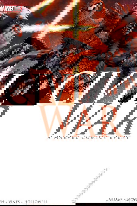 TRE MARVEL UNIVERSE IS CRANGING, IN THE WAKE OF A TRAGEDY CARTOGNI PROPOSES THE SUPER HERO REGISTRATION ACT REQUIRING ALL COSTUMED MERDES TO UNMASK THEMSELVES MORE THE GOVERNMINE DIVIDEO THE NARONS GRIATEST CHAMPIONS MUST FACH DECIDE HOW TO REACT DECISION THAT WILL ATTER THE COURSE OF THEIR LINES FOREVER